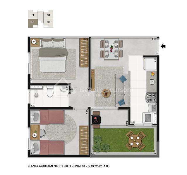 São opções de plantas com 41,10m² na unidade padrão e 46,89m² na unidade garden, que oferece o diferencial do quintal privativo.